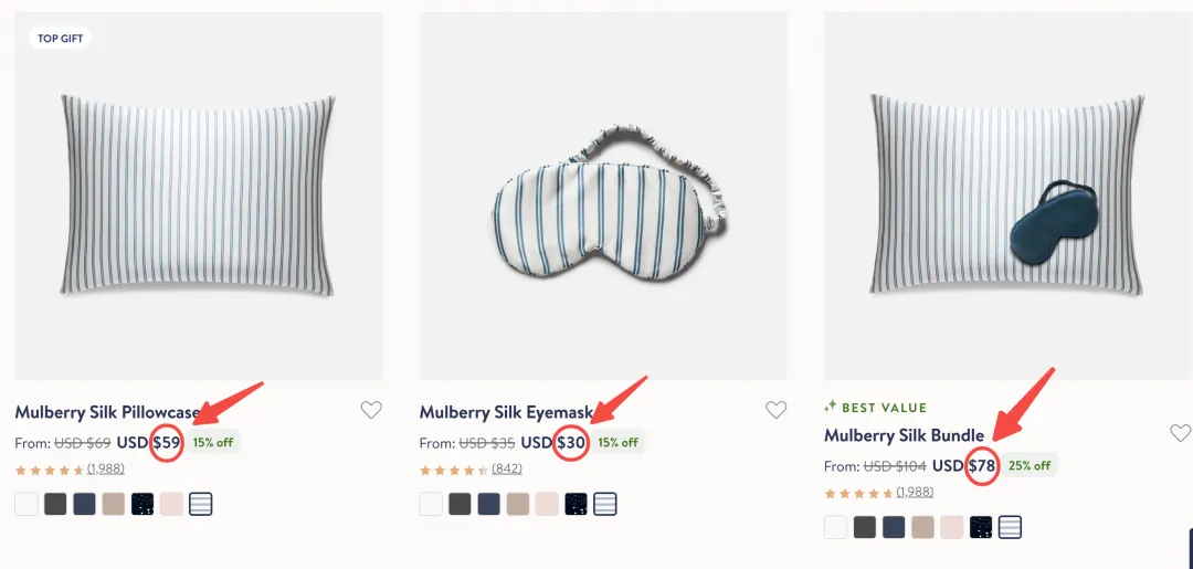 还有一个值得一提的小细节,Brooklinen 会把单品价格和组合价格放一起形成强烈对比,顾客不买都觉得亏。