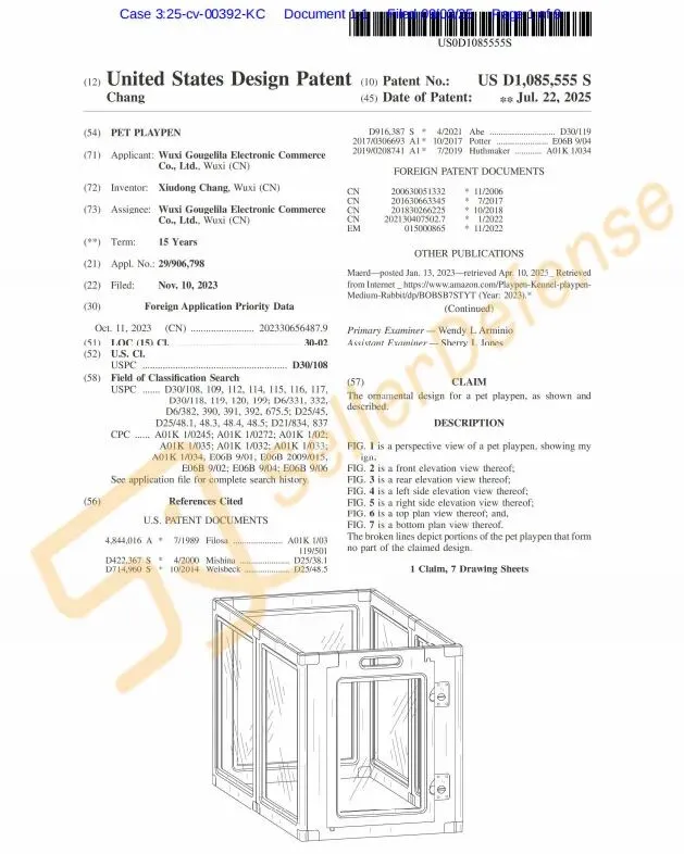 本案为国人原告,案件涉及专利产品是一款宠物围栏。专利细节如下,宠物用品卖家速查下架!