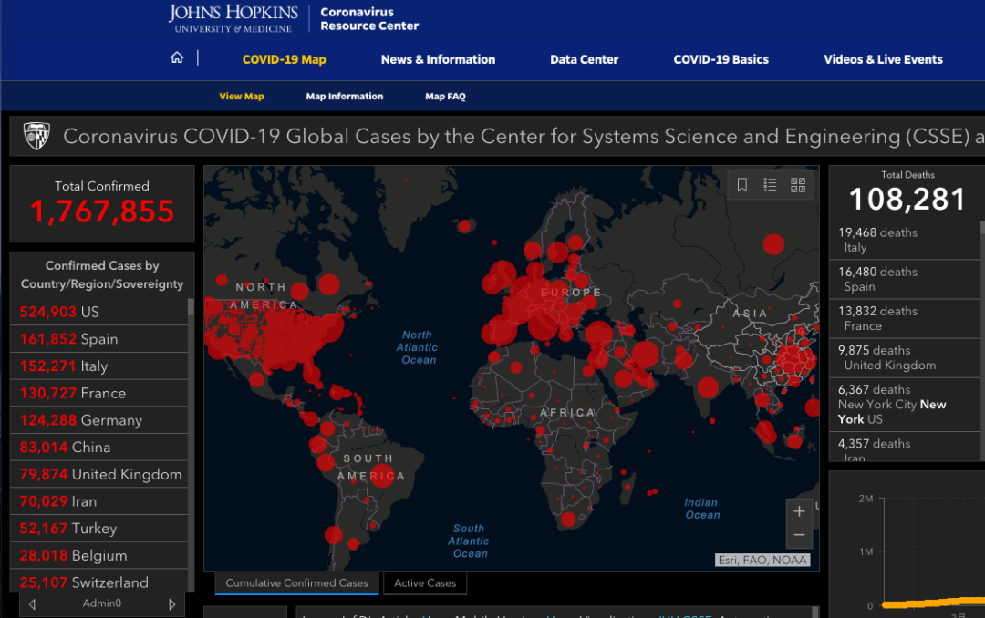 美国约翰斯·霍普金斯大学最新统计数据显示,截至北京时间4月12日7时,全球累计确诊新冠肺炎病例已超175万例,达到1767855例,累计死亡108281例。其中,美国累计确诊524903例,累计死亡20389例,成为目前全球累计确诊病例数、累计死亡病例数最多的国家。