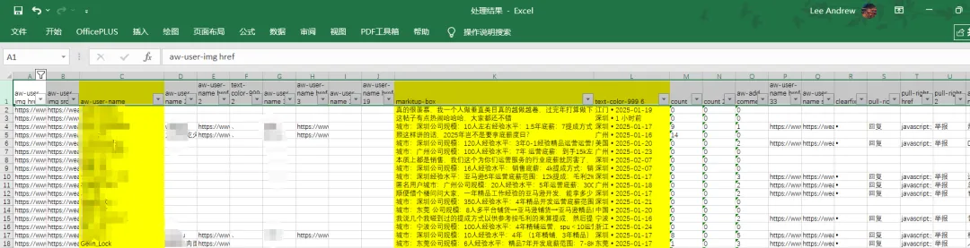 其中对我们有用的信息为发帖ip,发帖内容,以及发帖时间。发帖内容又包含了城市,公司规模,底薪,提成,职业等重要信息。我们利用工具进行整理细化,得出结果如下: