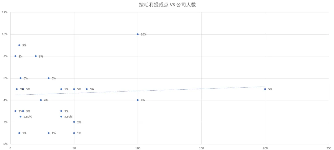 接下来我们排除开荒,合伙人等特殊情况,排除一家3000人公司这种过来瞎捣乱的,来看下用毛利润提成的公司人数和提成点的关系: