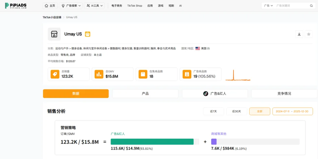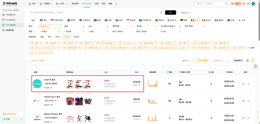 这个名字此前并不常出现在法国健身器材市场的主流视野中,却已经进入类目前列。顺着 PiPiAds 的数据线索核对后,我们很快发现,这家店铺背后其实是一家来自浙江、在健身器材制造领域深耕三十多年的企业——Umay 佑美。30 年制造底盘,决定了 Umay 的内容上限。