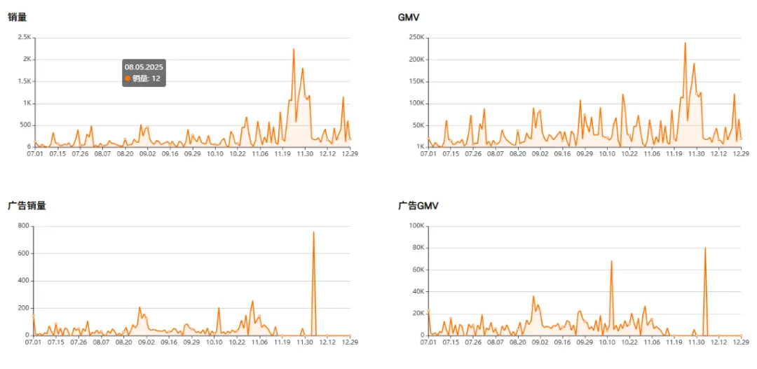 进一步对比广告销量与广告 GMV ,可以发现广告贡献更多呈现为阶段性的尖峰,而非持续输出。广告在关键节点集中放量,快速拉高短期成交,但并未承担长期稳定出货的角色。