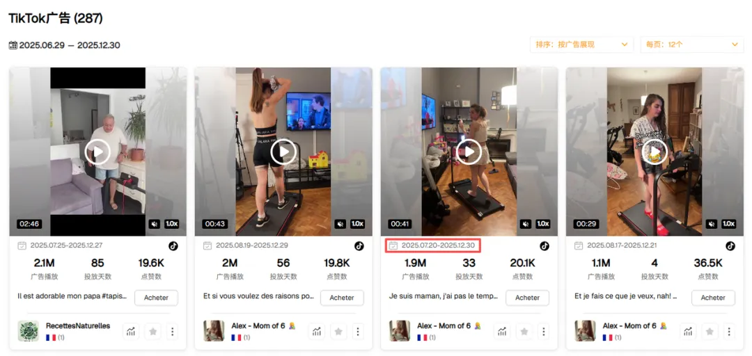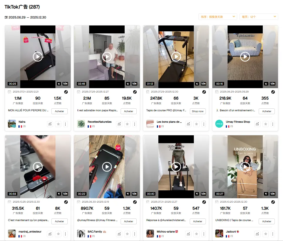 从销量排行与达人覆盖的对应关系中可以看到,排名前列的走步机与跑步机产品,均对应更高的达人数量与广告曝光强度。头部 SKU 普遍由 30–50 位以上达人反复产出内容,部分单品广告展示量已达到 数百万级。这些素材并非一次性使用,而是对表现稳定的内容持续复投,用于不断强化相同的使用场景与用户反馈。