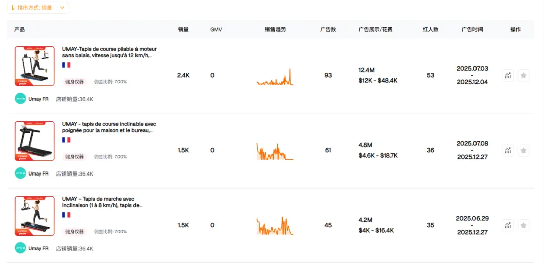 在这一背景下,Umay 开始认真评估并推进欧洲市场。6 月,首批货物抵达法国海外仓,即便页面尚未完全优化,店铺也开始出现自然订单;7 月大促期间,本地达人直播进一步承接转化,销量持续抬升,走步机、跑步机等核心产品逐步进入类目热卖行列。