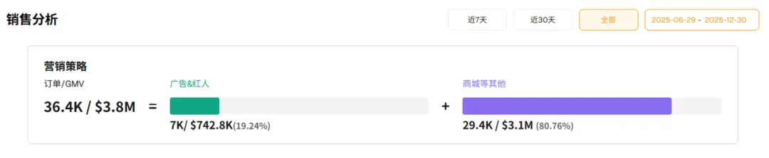 这种结构直接改变了成交路径。数据显示,广告与红人直接贡献的订单占比依然维持在较低水平,但大量销量集中在头部单品上,且转化更多发生在非广告场景中。达人在这里承担的并不是“即时卖货”的角色,而是通过高频、重复、真实的内容露出,让产品在用户心中逐步变得可信、熟悉,最终在更自然的购买节点完成决策。