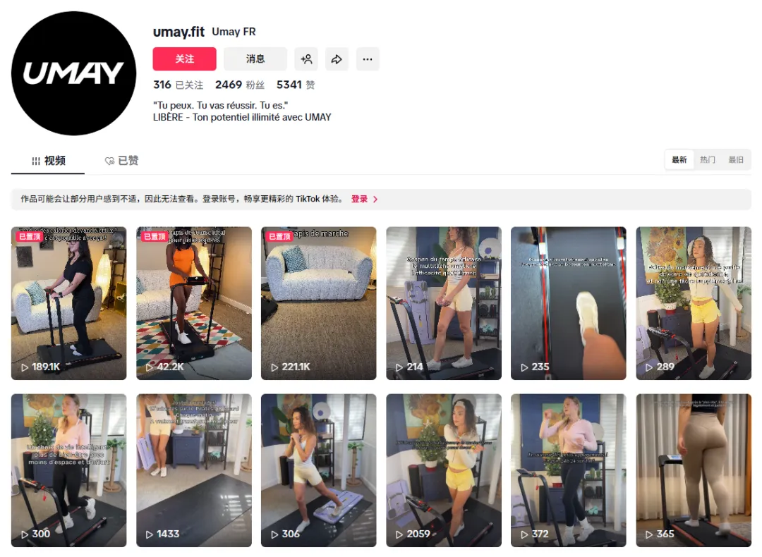 在高客单健身器材的转化路径中,直播并不负责制造认知或建立信任,而是用于解决最后一层决策问题。当前期内容与达人已经完成“看见”和“相信”,直播只需要在合适的节点出现,就能推动购买发生。从 Umay FR 的账号内容可以看到,法国站并未将直播作为高频主阵地。整体内容以短视频为主,画面高度生活化,直播更多承担阶段性承接功能,而非持续曝光工具。