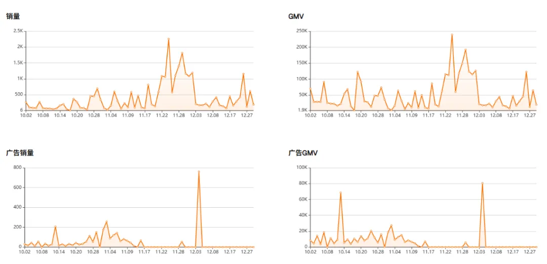 对比销量/GMV 与广告销量/广告 GMV 可以发现,广告成交更多呈现为阶段性尖峰,而整体销量与 GMV 的抬升更连续。广告在这里承担的是“加速器”角色,用于放大内容与市场反馈,而非独立完成成交,大量转化最终发生在非广告场景中。