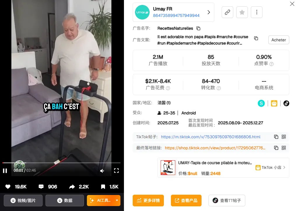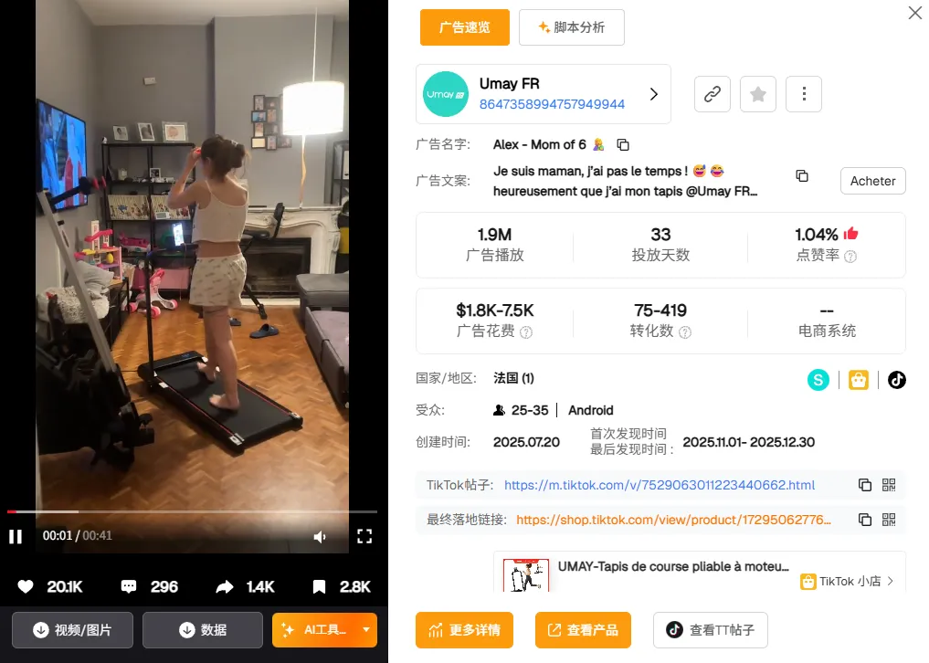 这条广告用最放松、最真实的日常场景直接击中法国女性用户的生活方式,博主在家里一边走步、一边护肤、一边追剧,通过旁白的提问将速度、坡度、安全夹等产品核心卖点顺滑地嵌入对话中,以轻松幽默的祝福收尾。让 Umay 从健身器材变成轻自律生活的一部分,正是这种去防御、去销售感的表达,使内容具备了被持续放量与反复调用的基础。