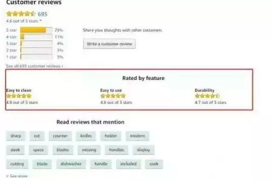 如图,这个产品从“Easy to clean”“Easy to use”“Durability”三个特点进行评分的,不同产品会不同。