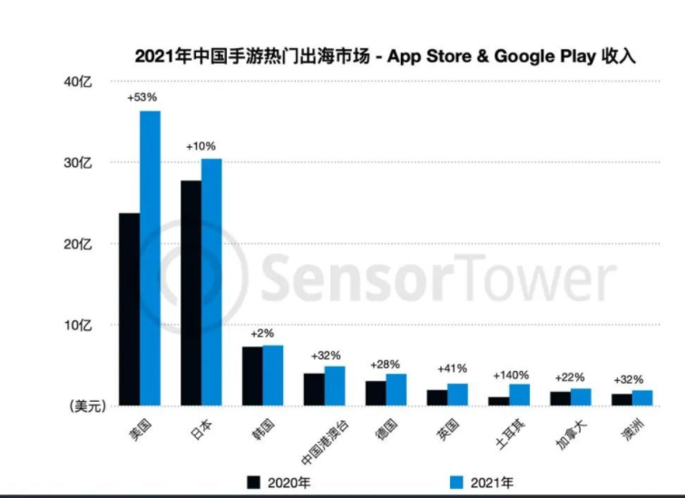 美国市场为TOP30手游贡献了36亿美元的收入,相较2020年增长53%,取代日本,成为中国手游最大的出海市场。
