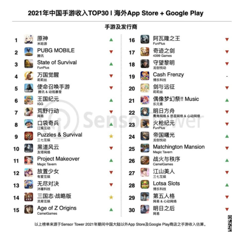 出海收入TOP30手游产品在App Store和Google Play的总收入达到115亿美元,较2020年92.4亿美元增长24%,是2019年的1.8倍。