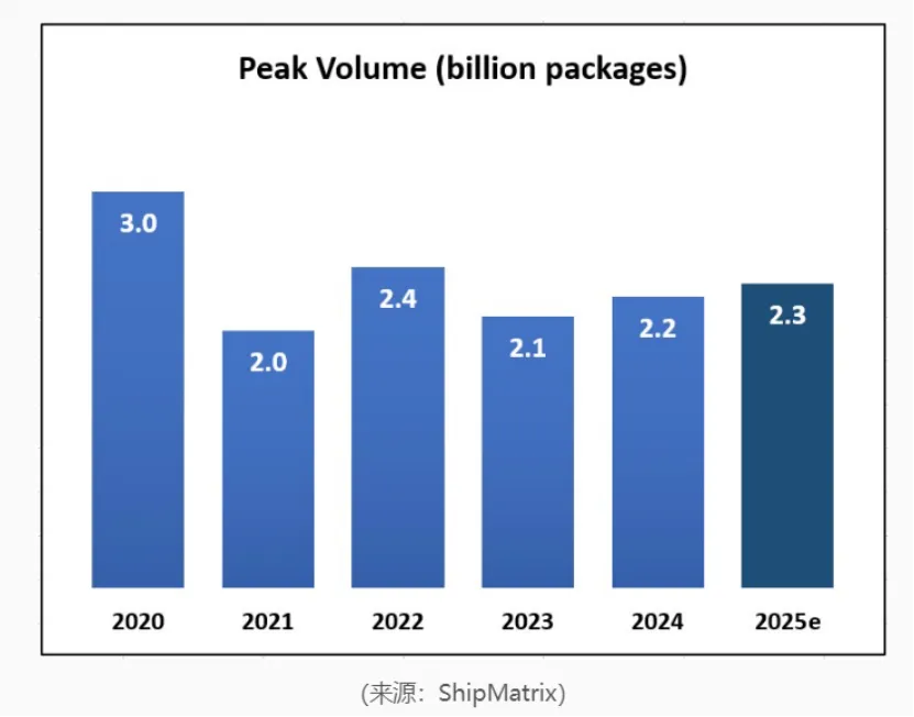 自2021年以来,旺季包裹峰值基本持平。ShipMatrix估计,美国在旺季期间将投递23亿件包裹,较2024年同期增长5%,主要受益于今年多出一个购物日。