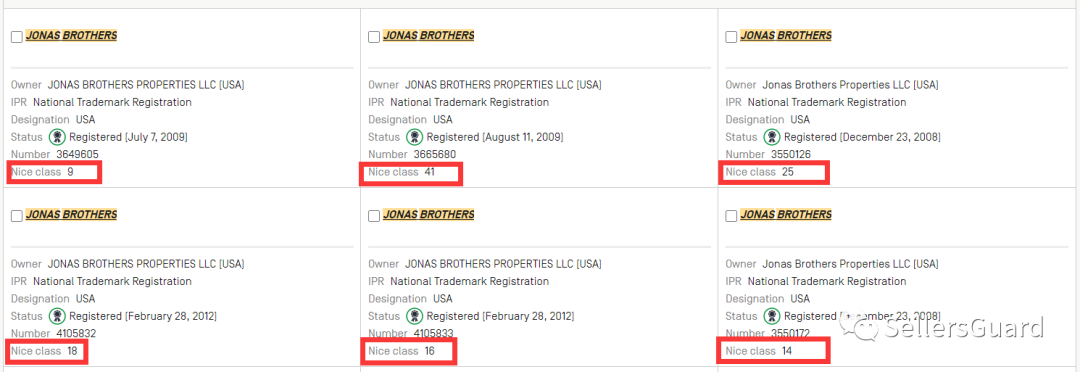 乐队名字Jonas Brothers为注册商标,注册类别在大类9,14,16,18,25,41: