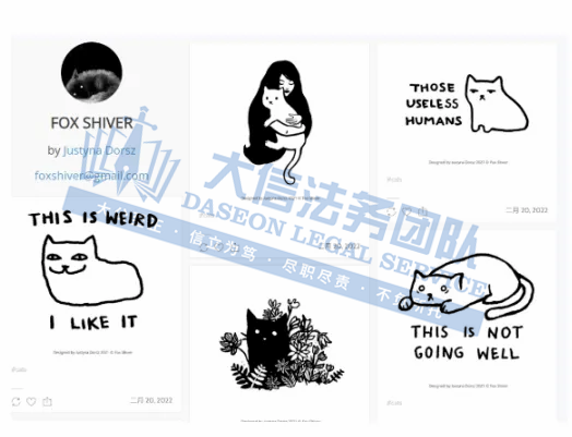 原告是一位来自波兰的艺术家和独立游戏开发程序员,她的简笔画作品具有独特的风格,主要以猫为主题,配以简洁的线条和有趣的文字,吸引大量猫咪爱好者。她创办了文创品牌Fox Shiver LLC,将这些艺术作品转化为商业价值,授权用于服装、饰品等周边产品,打造独特市场定位,作品兼具艺术性与实用性。