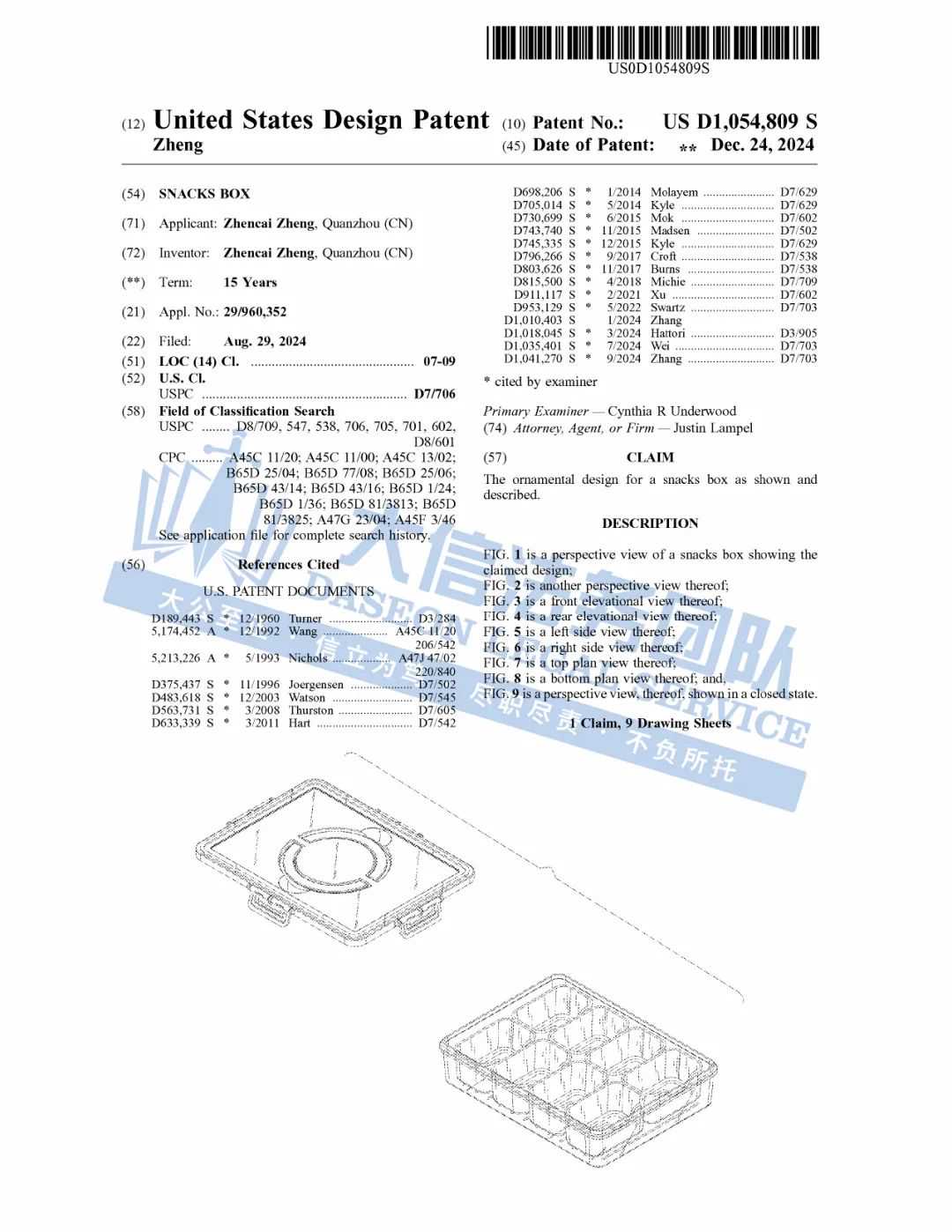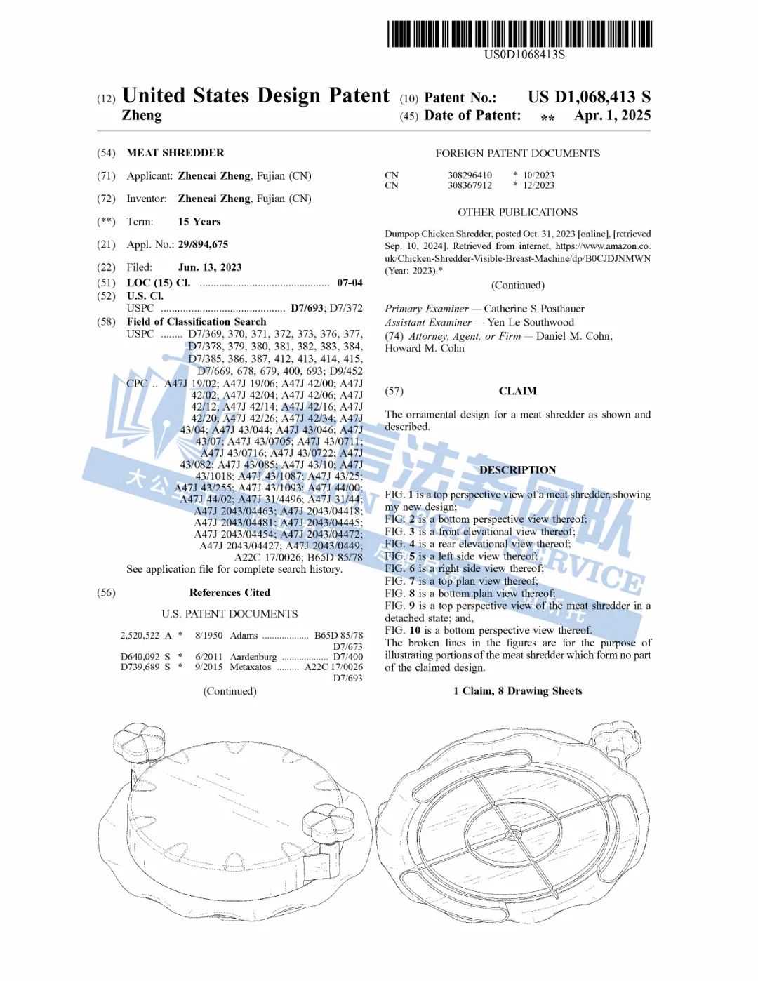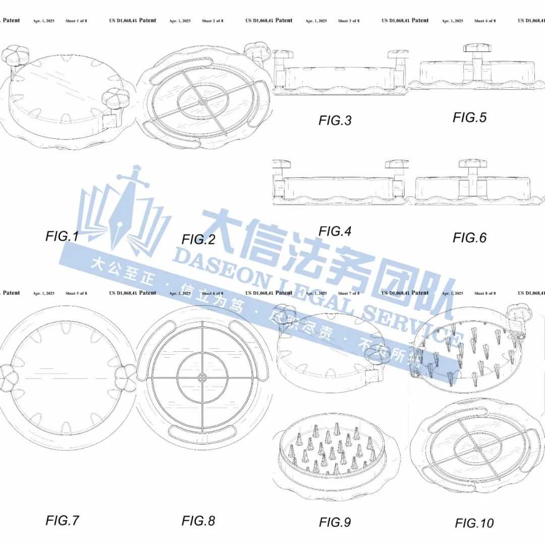 此案是匿名专利维权,目前还为公开具体的案件信息,但经查询,旗下注册了两款外观专利,D1054809,于2024年12月24下证,D1068413,于2025年4月1日下证,以下是涉及专利的具体信息,跨境卖家们尽快检索下架,避免造成更大的侵权损失!