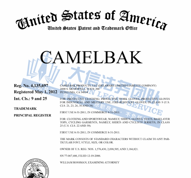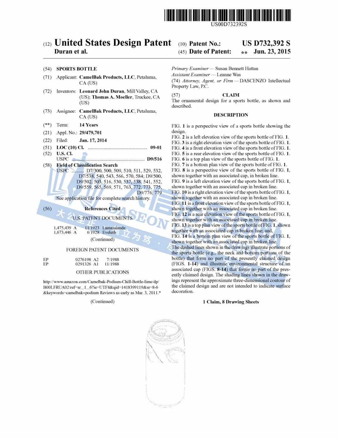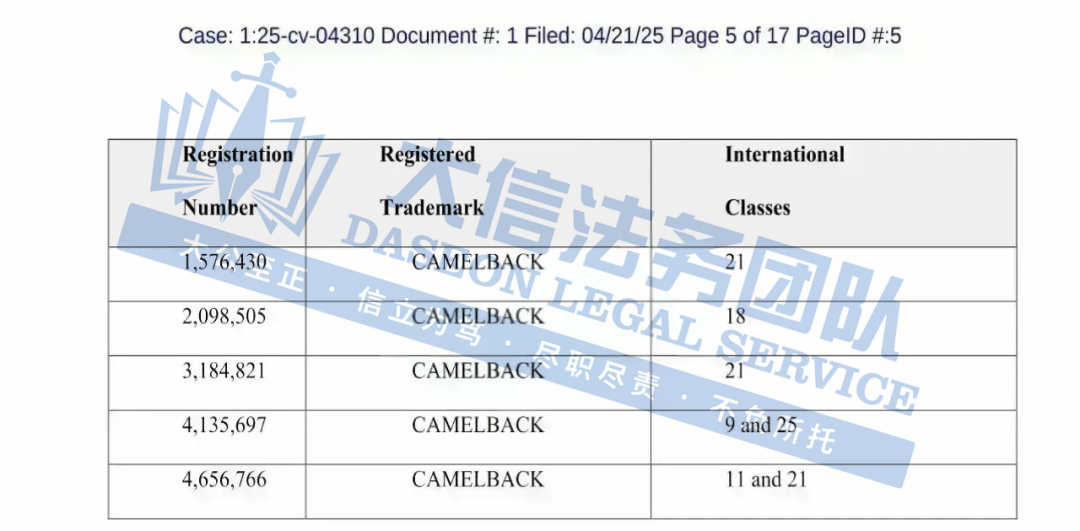 此案为商标+专利维权,共涉及5个商标,商标词主要为“CAMELBACK”文字商标,除此之外,原告还注册了一项外观专利,专利号为D732392,目前有近30个店铺被波及,以下是具体涉案信息,跨境卖家尽快检索下架,避免造成TRO侵权损失!