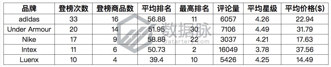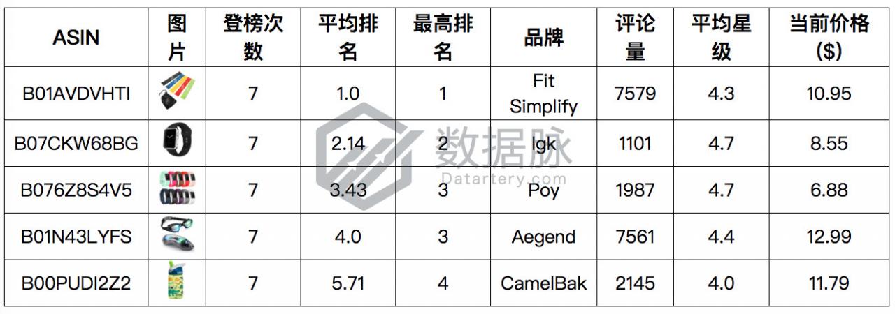 此外,来自品牌Poy的运动手环腕带多次跻身榜单前三,也取得了平均排名3.43的成绩,位列商品综合排名第三;