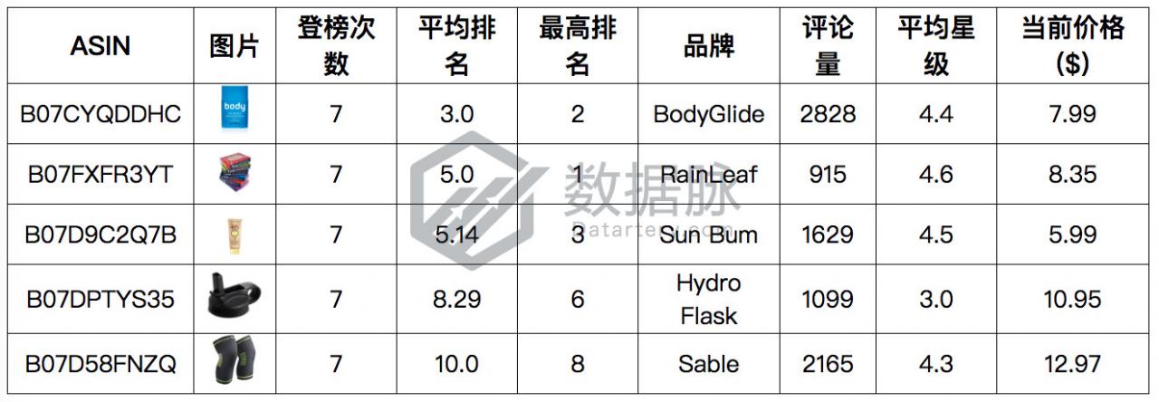可以看到,在上周Sports & Outdoors品类的Hot New Releases榜单中, 品牌BodyGlide的智能手表腕带多次跻身榜单前三,以平均排名3.0位列商品综合排名首位,