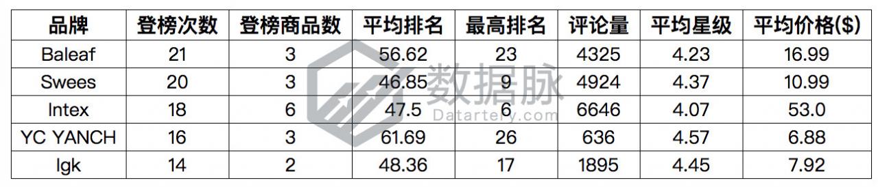 可以看到,在上周Sports & Outdoors品类的Hot New Releases榜单中, 运动服饰品牌Baleaf每日登榜3款商品,累计登榜21次,位列品牌综合排名首位;运动手环替换表带品牌Swees六度登榜3款商品,累计登榜20次,位列品牌综合排名第二位;品牌Intex登榜6款商品,累计登榜18次,位列品牌综合排名第三位。
