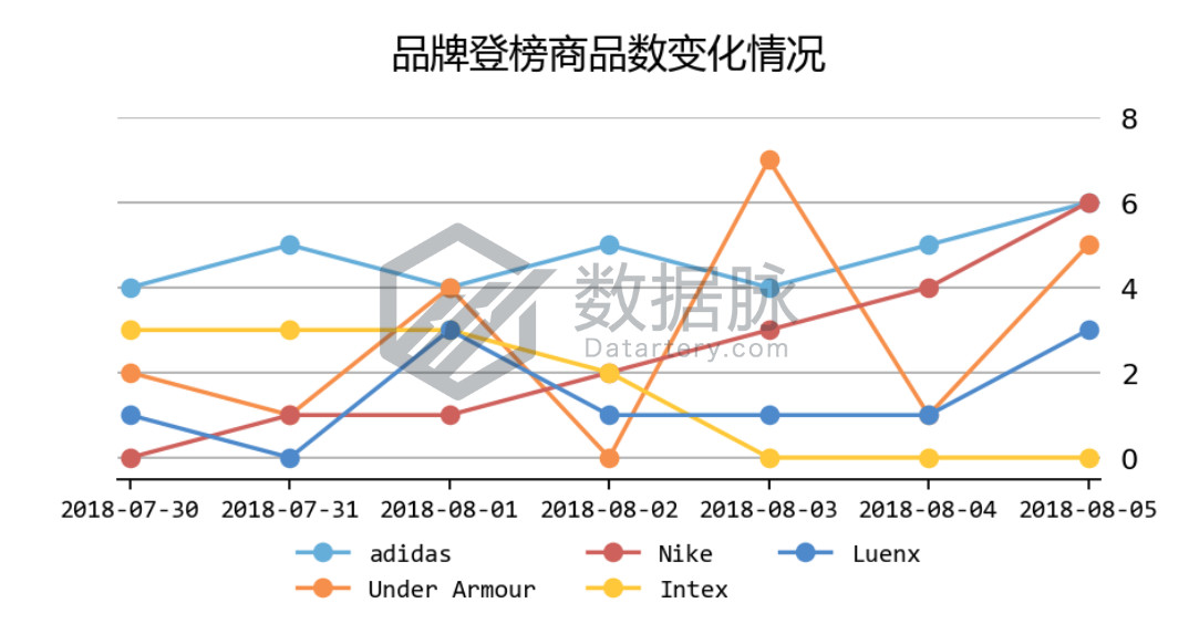 可以看到,在上周Sports & Outdoors品类的Movers & Shakers榜单中, 品牌adidas每日至少登榜4款商品,以33次的总登榜次数位列品牌综合排名首位。骆探长(shujumai.com)也同时注意到,品牌Under Armour、品牌Nike分别凭借登榜20、17次,分别位居品牌综合排名第二、三位。