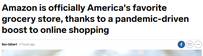 在2020年疫情彻底改变了经济结构和零售方式,这也最终造成了亚马逊在今年的杂货零售商中脱颖而出。它在客户安全评级和疫情应对方面的表现远超其他零售商。而在2020年在线杂货的购物量急剧上升,在4月下旬的一周之内,亚马逊的销售额就比去年同期涨了将近三倍(289%)。