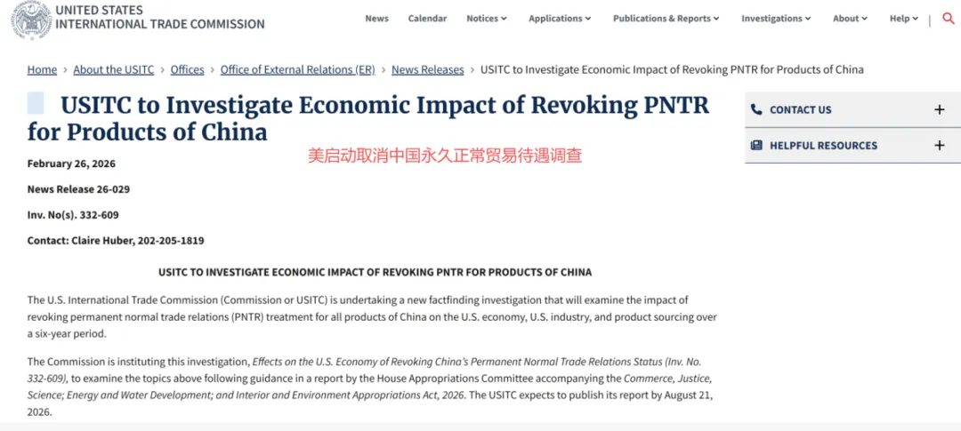 当地时间 2026 年 2 月 26 日,美国国际贸易委员会(USITC)宣布,根据美国国会要求,正式就撤销中国 “永久正常贸易关系”(PNTR,即最惠国待遇)资格展开事实调查,并计划在今年 8 月 21 日前完成相关报告。