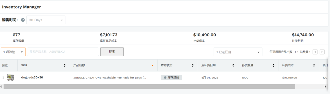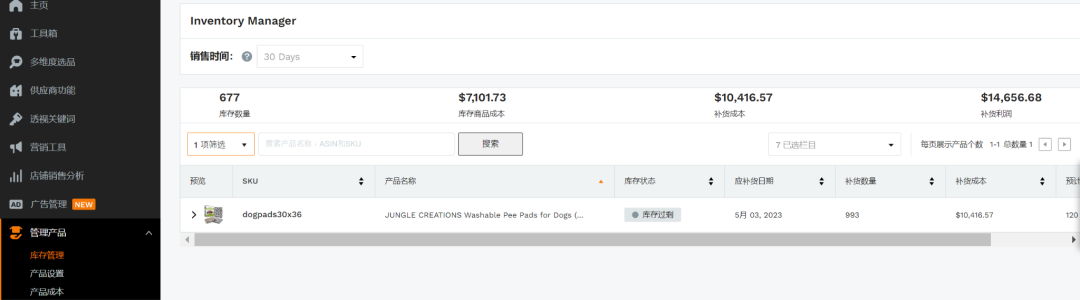 绑定店铺后,点击管理产品——库存管理,即可看到店铺中所有商品当前的库存情况,包括库存数量、库存商品成本、补货成本等信息。