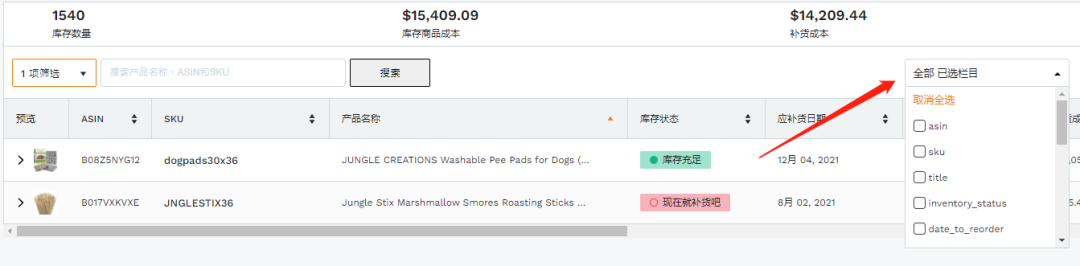 点击右上角筛选按钮,还可以按照ASIN,ASIN,商品名、库存状态以及补货时间对商品进行分类。