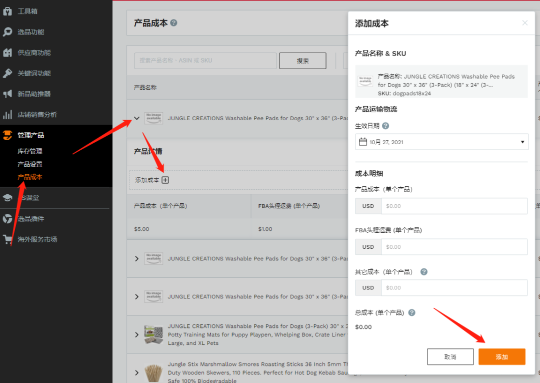 在管理产品-产品成本中,设置交货时间和补货周期所需的天数,并在产品设置中,为每个SKU输入成本,经过设置后,库存管理会根据产品的销售速度,交货时间与补货周期,自动判断当前的库存状况,提醒卖家是否应该补货。