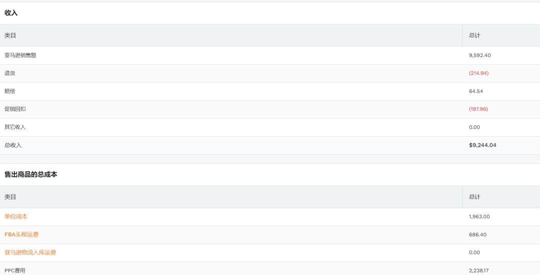 通过损益表,卖家可以看到收入情况并拆分了售出商品的各项成本,包括FBA运费,PPC费用、退货费用、运营成本等各项支出,此表格可以帮助卖家分析,哪些地方的成本较高,有进一步优化的空间。