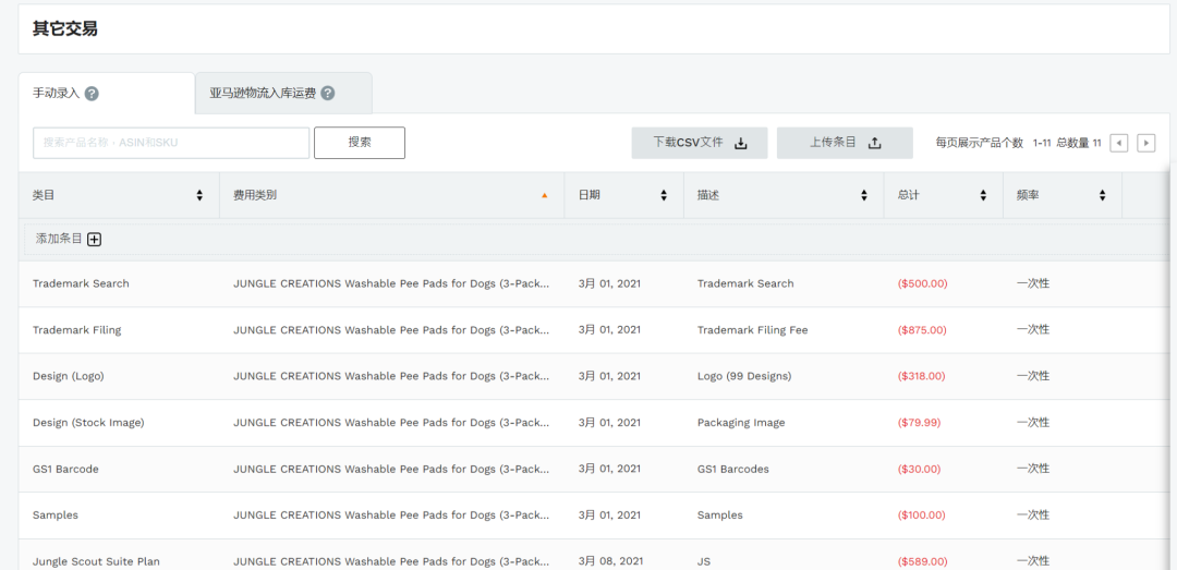 在费用表格中,卖家可以看到从微观角度看到各种支出的详细情况,如样品费用,商标注册费用等等,手动输入后,各项费用也会反映到利润分析的表格当中。
