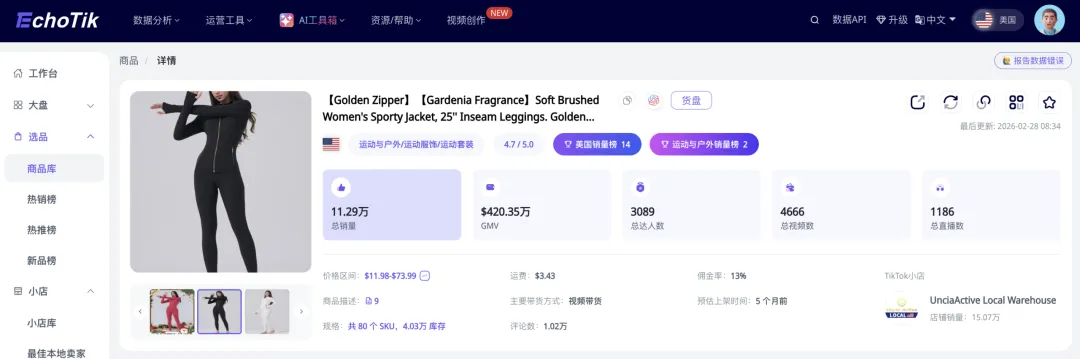 据Echotik数据显示,这个爆款瑜伽服,出自一家名叫UnciaActive Local Warehouse(@uncia_active_us_local)美区跨境TikTok小店,自去年10月上线TikTok以来,这款单品共计售出11.3万件!