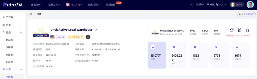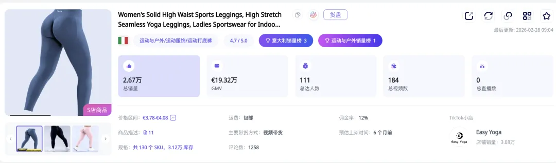 在Echotik热销榜单,有一款瑜伽裤热销欧洲多国,在意大利TikTok甚至登上了7日榜的销量第一名!增长曲线明显加速。