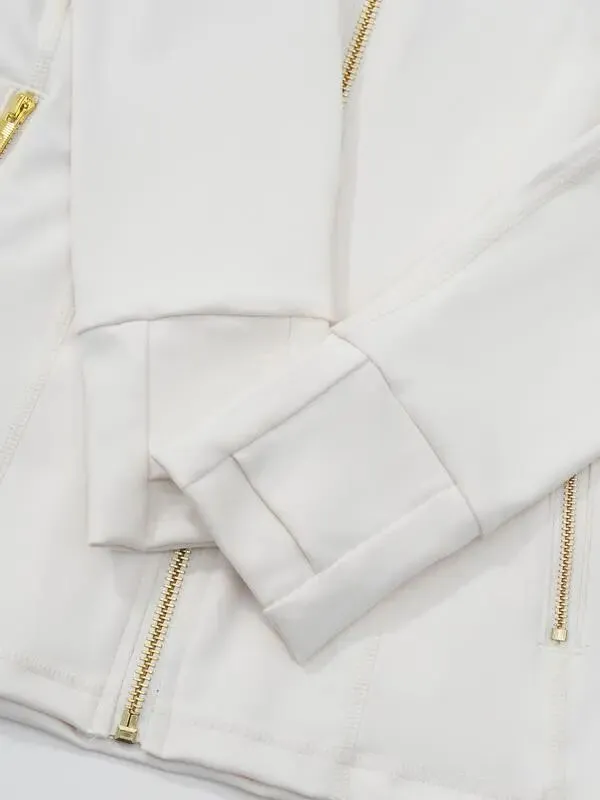 细节设计上,也明显围绕“运动 + 日常双场景”展开:金色拉链元素强化视觉辨识度,带口袋设计,提升实用性,袖口拇指孔设计,避免运动时袖口滑动,既可以进健身房,也可以直接当日常穿搭。