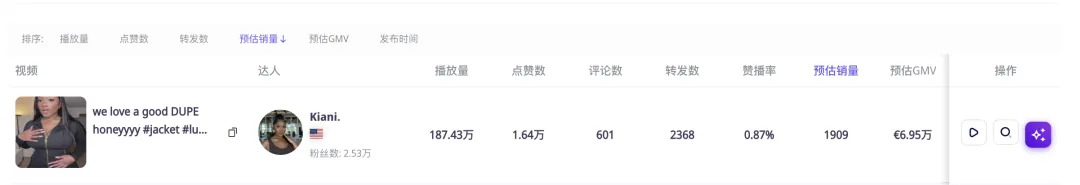 其中,带货量最高的一条视频,出自TikTok美区博主Kiani.,一条试穿测评视频,获得了180多万多播放量,带来近2000单成交。