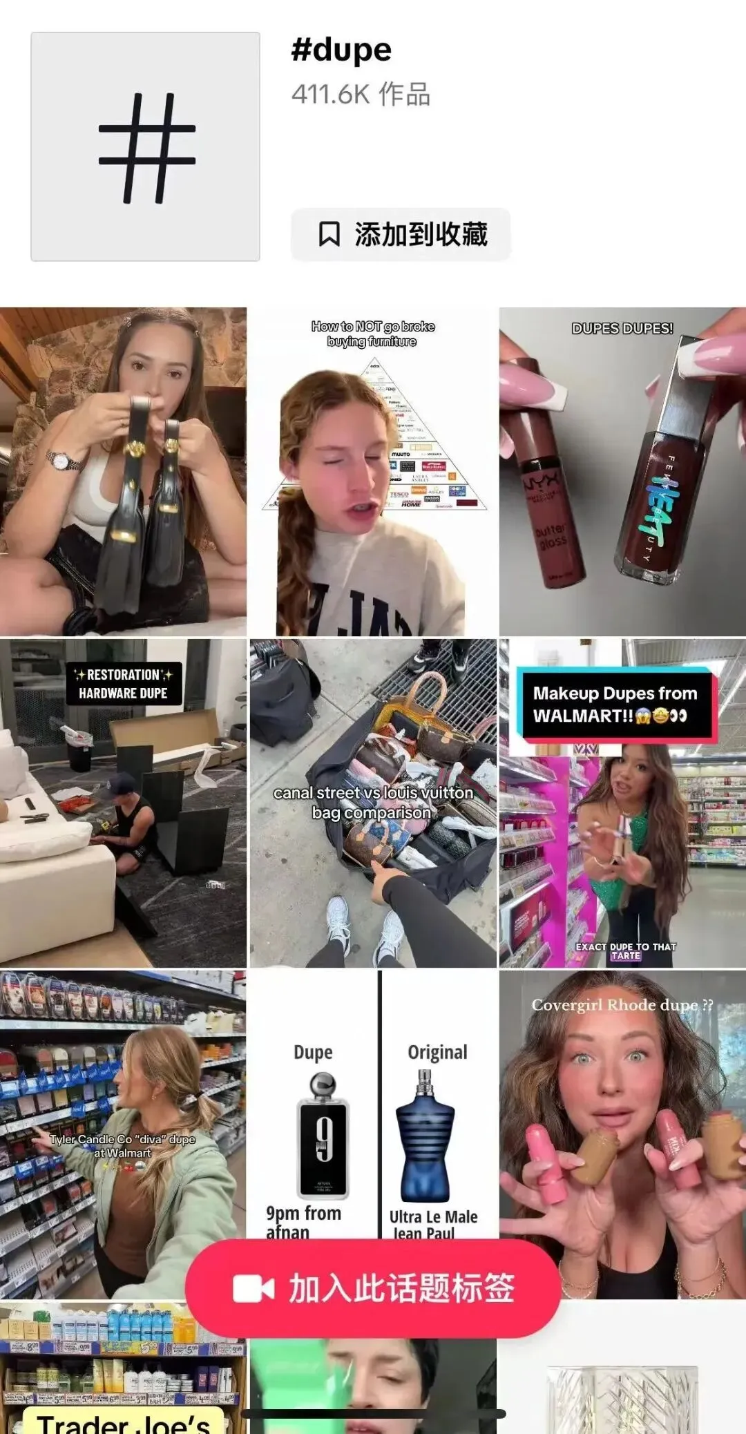 在TikTok,“找到一个好平替”,甚至变成一种值得炫耀的能力。#dupe 早已成为高频流量标签。