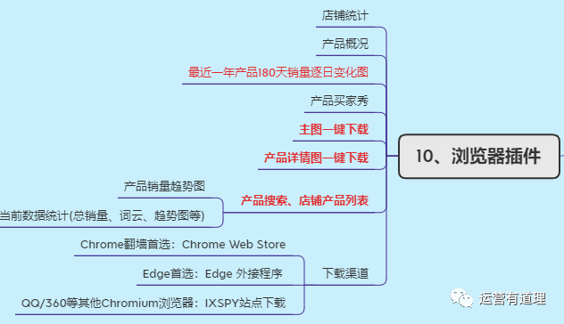 下图为功能列表思维导图,主要是各种销量趋势参考以及辅助图文下载两类。