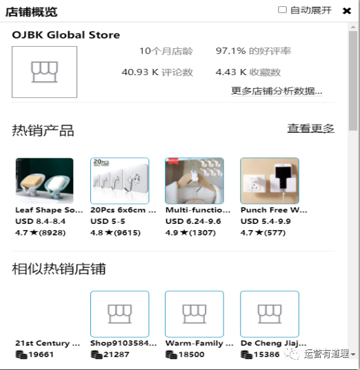 基本的店铺数据都有,不用另外访问店铺其他页面才能查看店铺详情。同类型热销店铺也可以很好寻找竞品店铺。