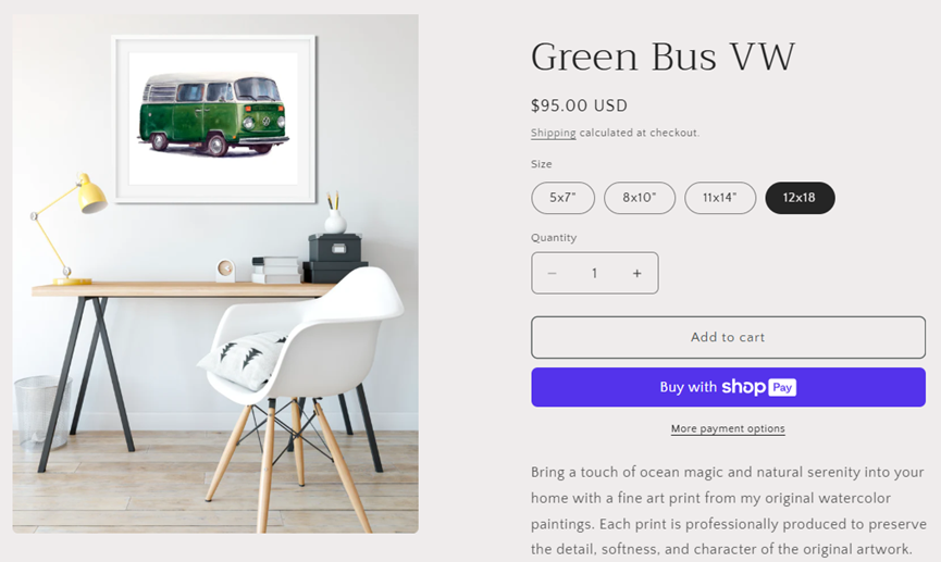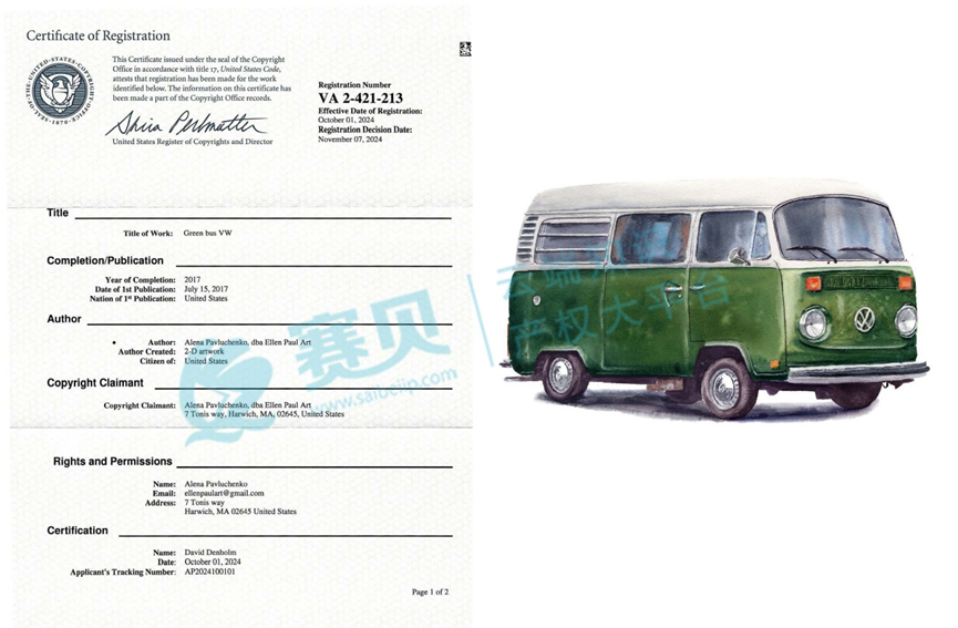 本次案件涉及三项版权内容如下,插画作品 “Green Bus VW”,即 “绿色大众巴士”,版权注册号 VA 2-421-213,创作完成年份是2017年,注册于2024年,赛贝提醒由Ellen Paul Art创作的作品均受版权保护,未经授权不得擅自使用,以免引发侵权风险。