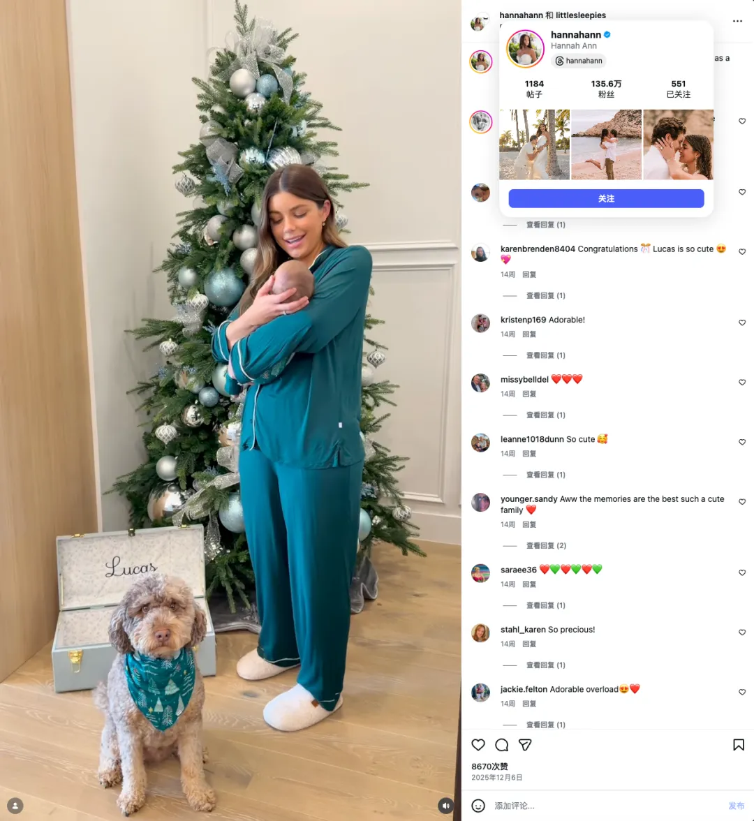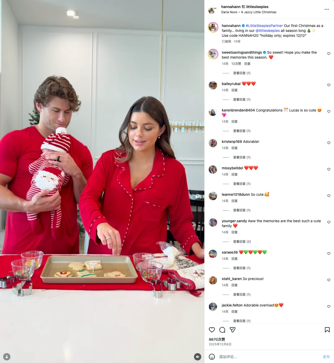 比如这个生完孩子后的LifeStyle博主Hannah Ann,Little Sleepies和她在去年年底开展的合作就是以“圣诞节”为主题进行的。