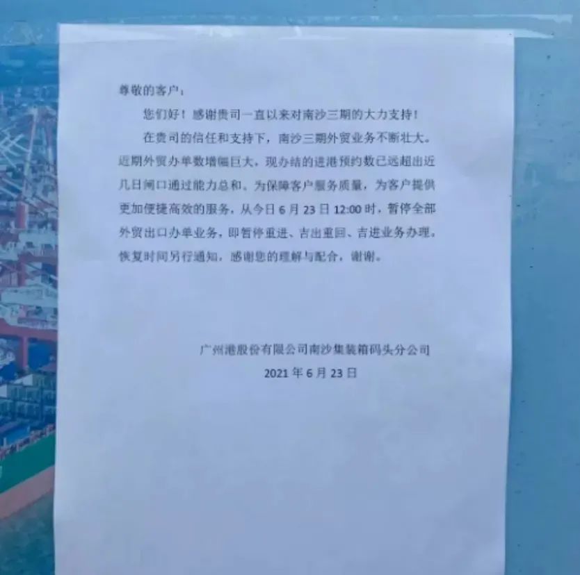 突发事件!!!广州南沙码头暂停全部出口办单业务,好在......