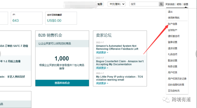 第一步:在亚马逊首页右侧导航“设置”中,可以找到“账户信息”,点击账户信息;