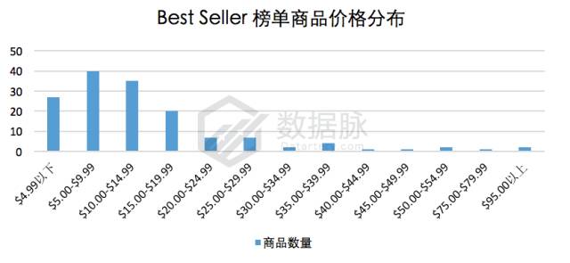 上周 Kitchen & Dining 品类 Best Seller 榜单商品最高价$99.46,最低价$0.01,平均价格$15.25,较上期分析有较为明显的下降。骆探长发现,上周榜单中的商品价格主要集中在$5.00-$14.99区间,其中23.81%的商品价格在$5.00-$9.99区间内,同时有超过20.83%的商品价格位于$10.00-$14.99区间;另外,上周仅有2款商品价格超过$95.00,占比1.19%。