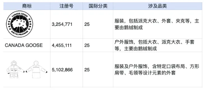 加拿大鹅作为知名户外服饰品牌,拥有多项注册商标,涵盖羽绒服、外套等核心产品及独特设计元素,未经授权使用相关商标或仿冒服饰设计,可能面临临时限制令、资产冻结等风险,建议相关卖家立即排查下架侵权产品。