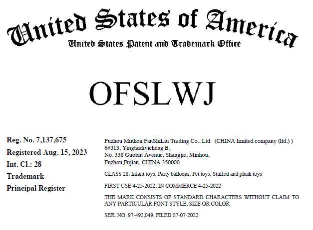 原告Fuzhou Minhao Fanshiliu Trading Co 专注毛绒玩具、节庆装饰以及儿童创意玩具的研发与销售。本案涉及 OFSLWJ 商标注册在第28类:派对气球;婴儿玩具;宠物玩具;填充毛绒玩偶。
