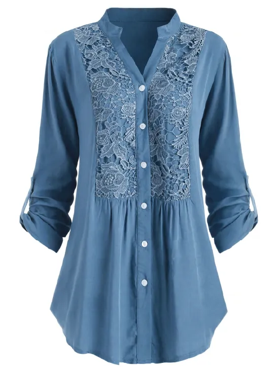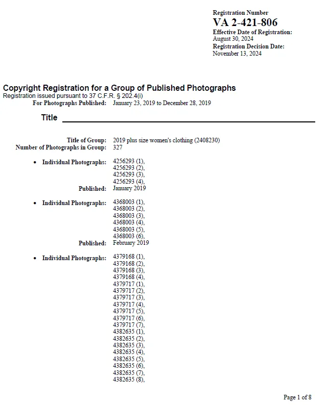 原告 Daning Zhou 注册一共有327张大码女装图片,案件版权图片公开为女士V领蕾丝上衣产品图:
