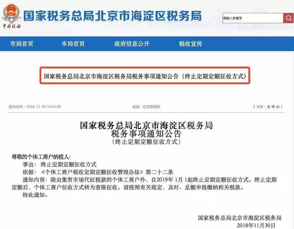 国家税务总局北京市海定区税务局11月30日通知:自2019年1月1日起终止定期定额征收方式,个体工商户征收方式转为查账征收,请及时、足额申报缴纳相关税款。有个体工商户的老板们、会计们注意了!