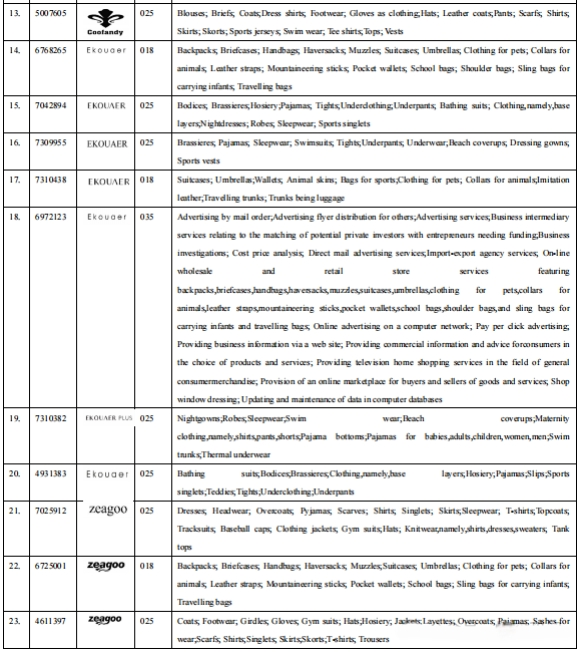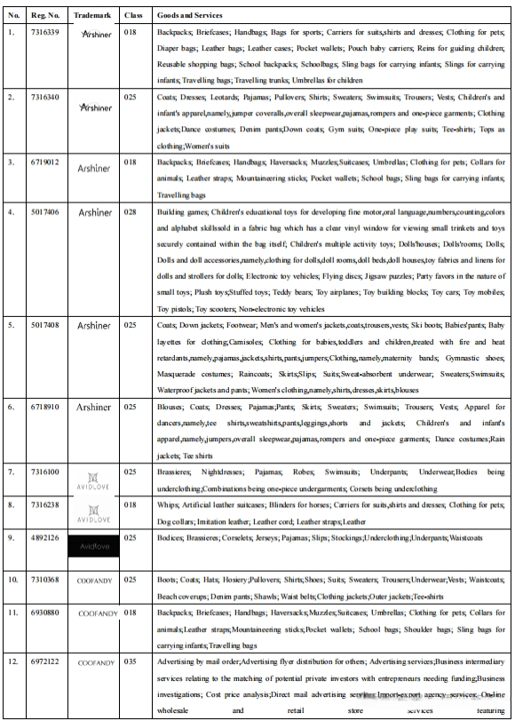此次维权涉及赛维名下的23个注册商标,主要集中在18、25、28等类目,服装、服饰及玩具卖家需注意避雷: