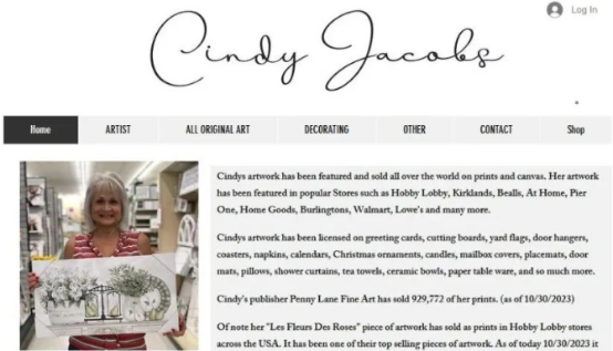 画家CYNTHIA JO JACOBS以艺名Cindy Jacobs进行创作和销售作品,热爱家居装饰、墙面仿漆工艺、珠宝制作以及家具橱柜翻新,擅长水彩、丙烯、钢笔画及混合媒介创作。